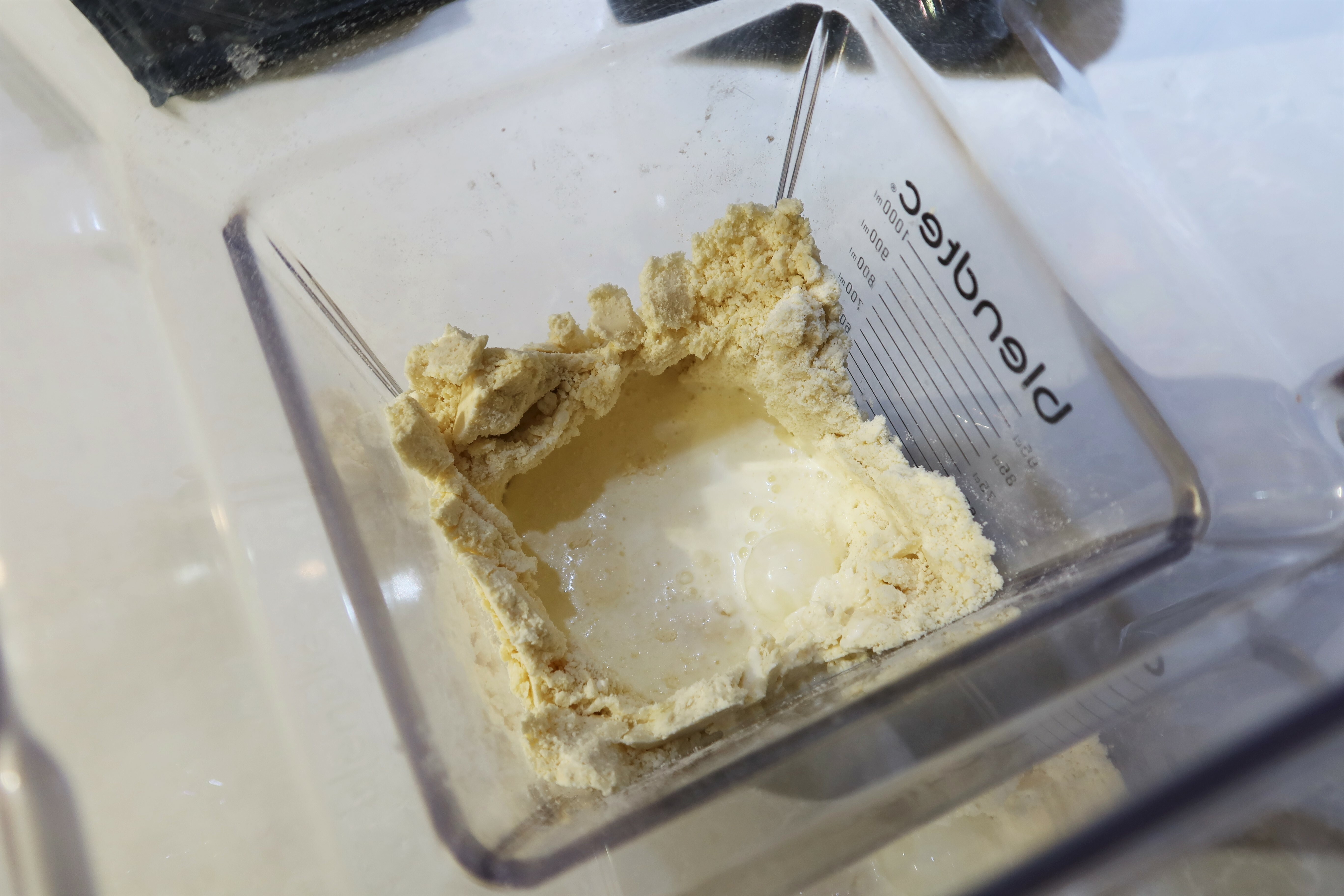 容杯中加入鮮奶油和1顆雞蛋,用低速將食材打成團