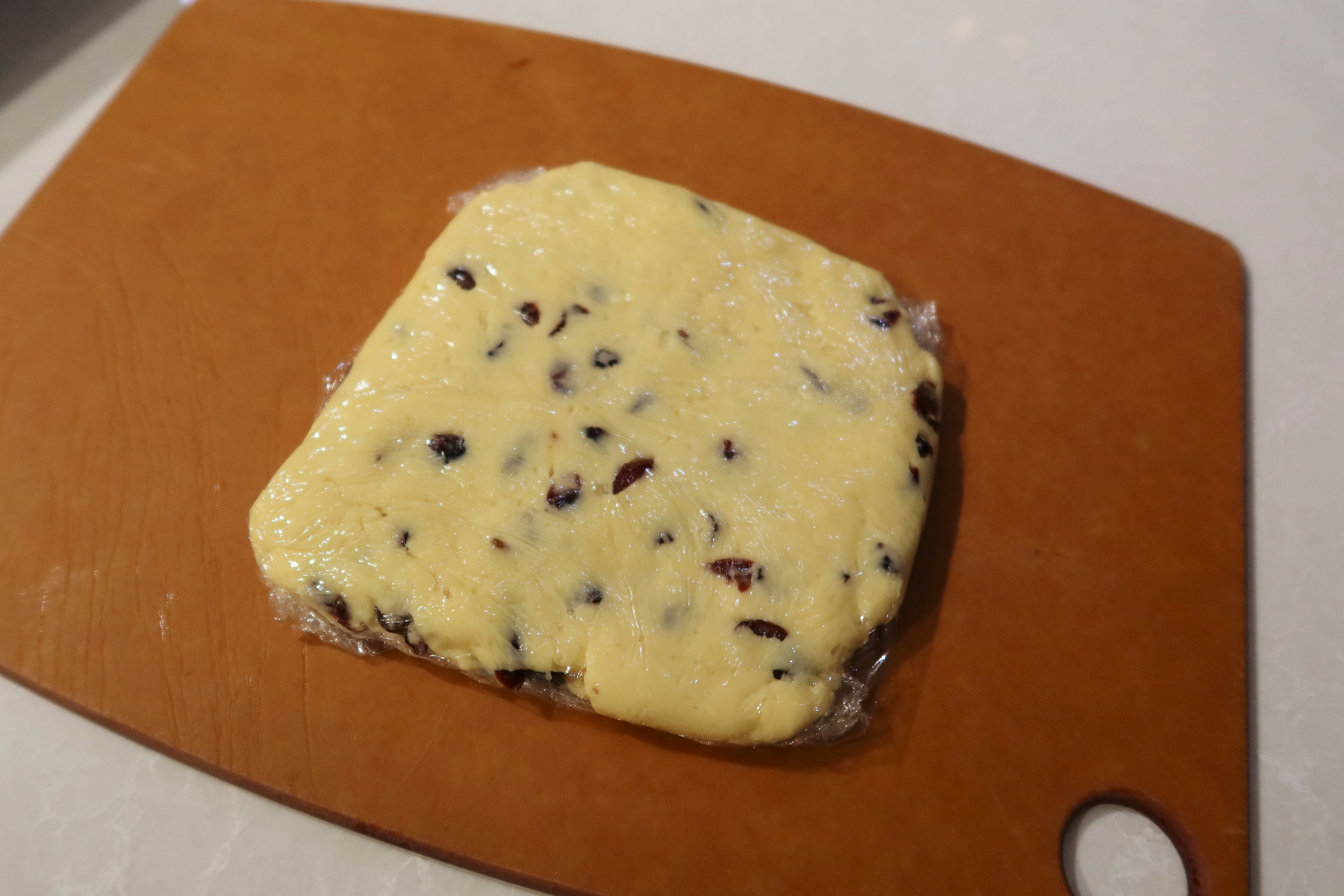 麵團中加入蔓越莓乾以刮刀輔助混合均勻