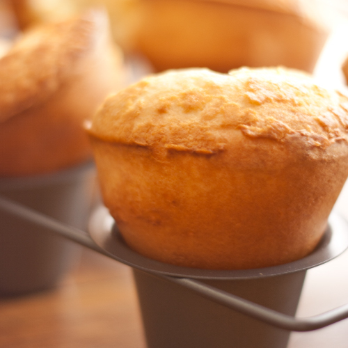 4. 從烤箱中取出烤盤,於每個泡芙杯倒入半杯麵糊,再送入烤箱烘烤20分鐘。