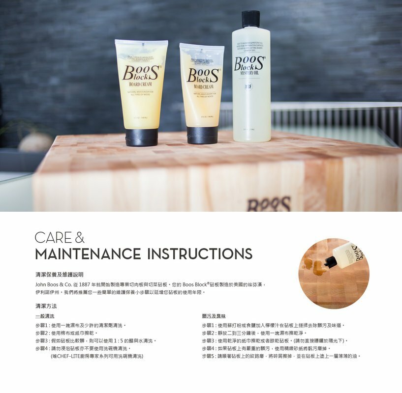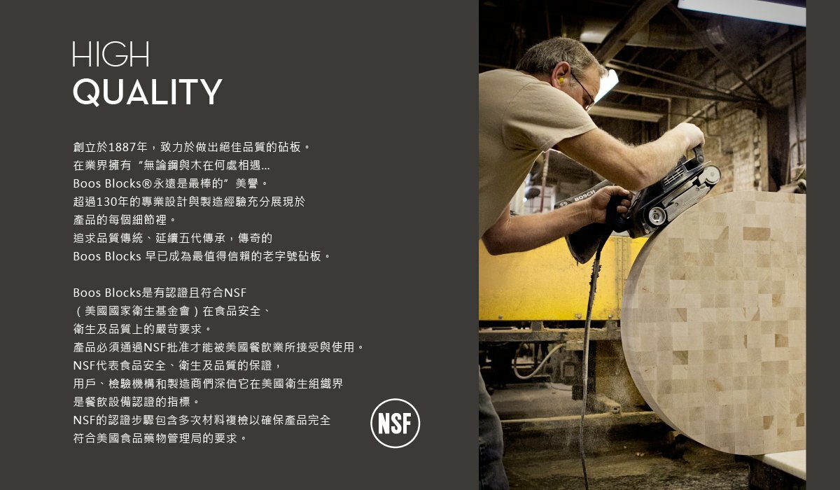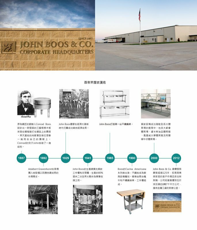John Boos & Company是美國歷史最悠久的一流廚房設備主要製造商之一。Boos BlocksR的產品自1887年至今都從美國伊利諾州的埃芬漢產出,可說是一流切菜板與砧板的代名詞。John Boos & Company 130多年來在製造絕佳的切菜板、砧板及食物準備設備上獨樹一幟。顧客們由使用經驗上可得知 Boos Blocks 今日對品質的追求就如同1887年公司剛創立時一樣重要,創辦人及其繼承人們在品質、技術及設計的追求上有其堅持。五代的經驗與技能結合最高品質、可再生且永續的硬木來造出擁有絕佳技術與獨創性的最高品質產品。熱情、精確、注重細節的傳統讓設計與製造的每個步驟更趨完善。