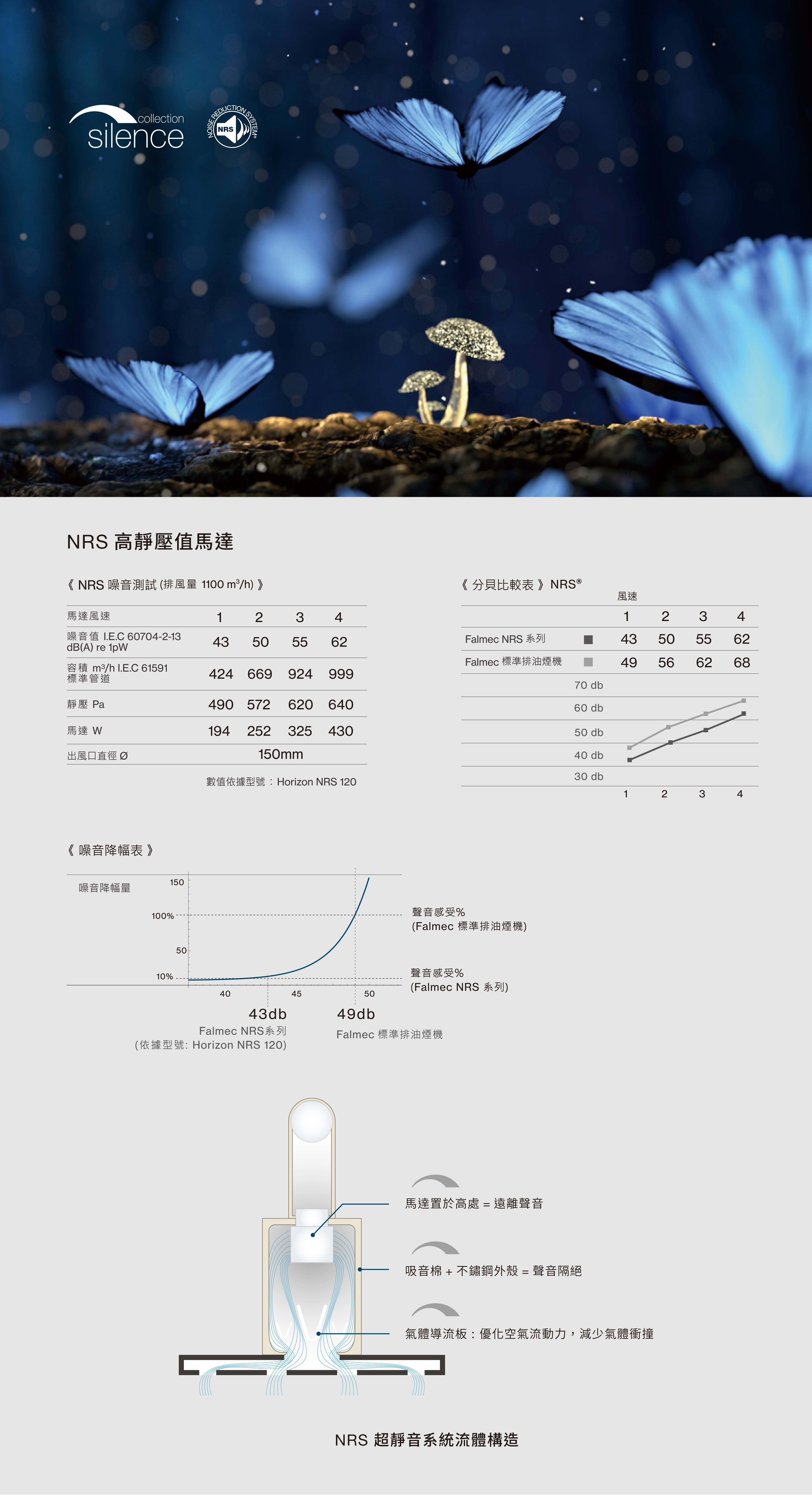 Falmec 獨家專利技術 Noise Reduction System,透過研發最適合降低噪音的獨特創新材質,將其安裝在油煙機內部,並且提升空氣的流動方式以減少阻力,有效讓油煙機的運轉音及震動降到最低!