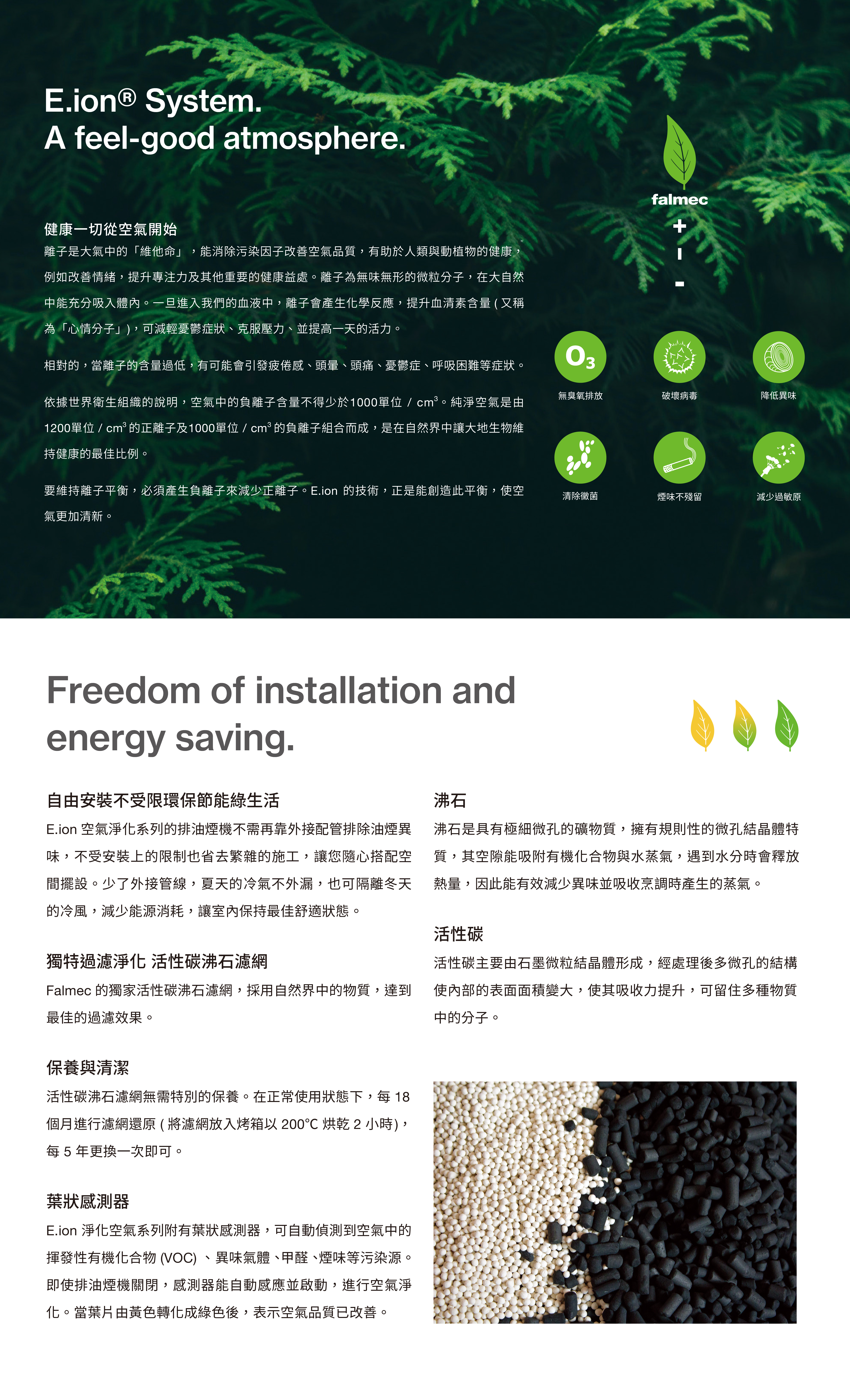 Falmec E.ion 空氣淨化系列的排油煙機不需要再靠外接配管排除油煙異味,不受安裝上的限制,也省去了繁雜的施工過程,讓您能隨心所欲地搭配空間擺設!