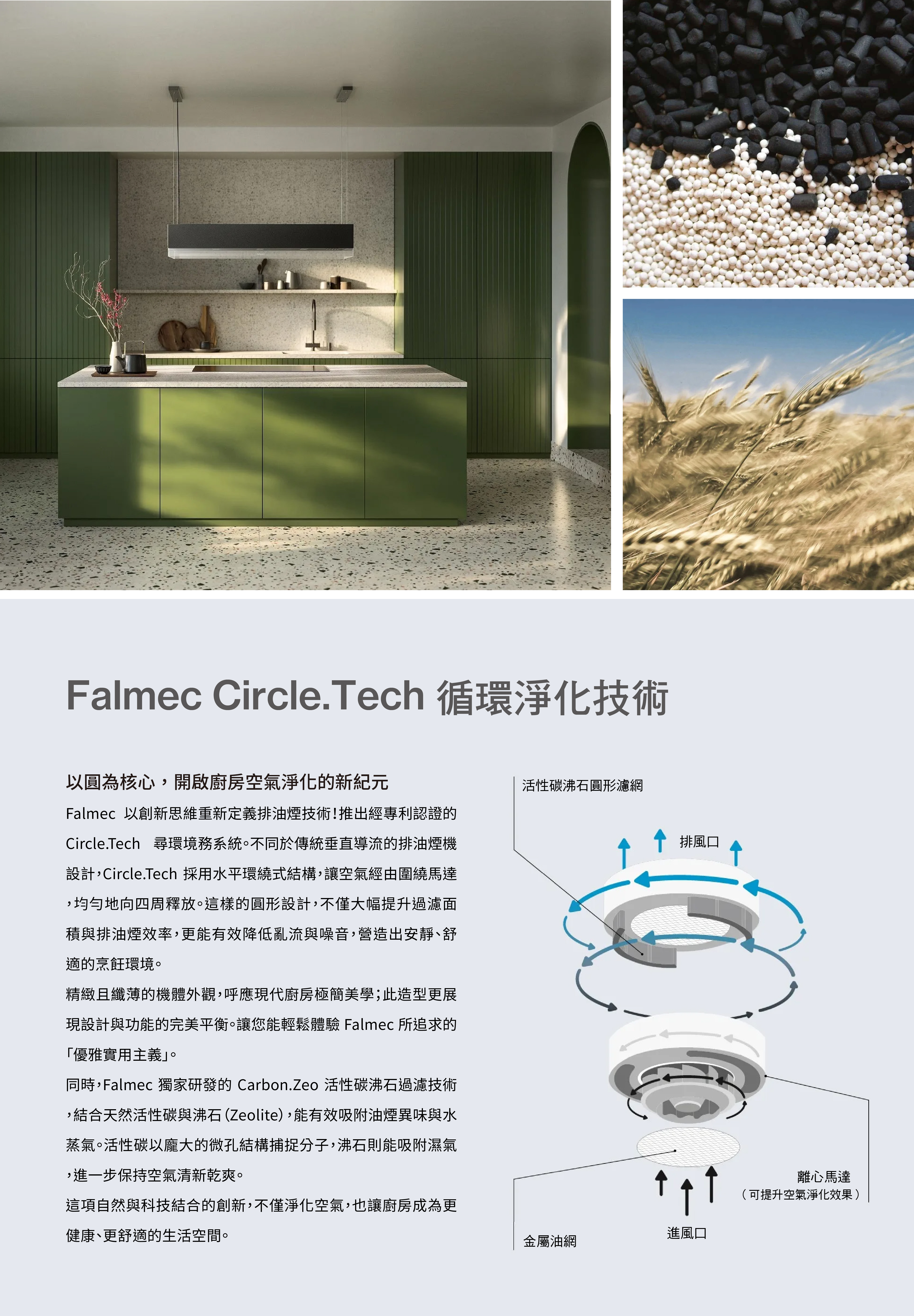 Falmec 以創新思維重新定義排油煙機,最新專利認證的 Circle.Tech 循環淨化系統!不同於傳統垂直的排油煙機,Circle.Tech 採用「水平環繞結構」,讓空氣經由圍繞馬達,均勻地向四周釋放。圓形設計,不僅大幅提升過濾面積與排煙效率,更能有效降低亂流與噪音,營造出舒適的烹飪環境。