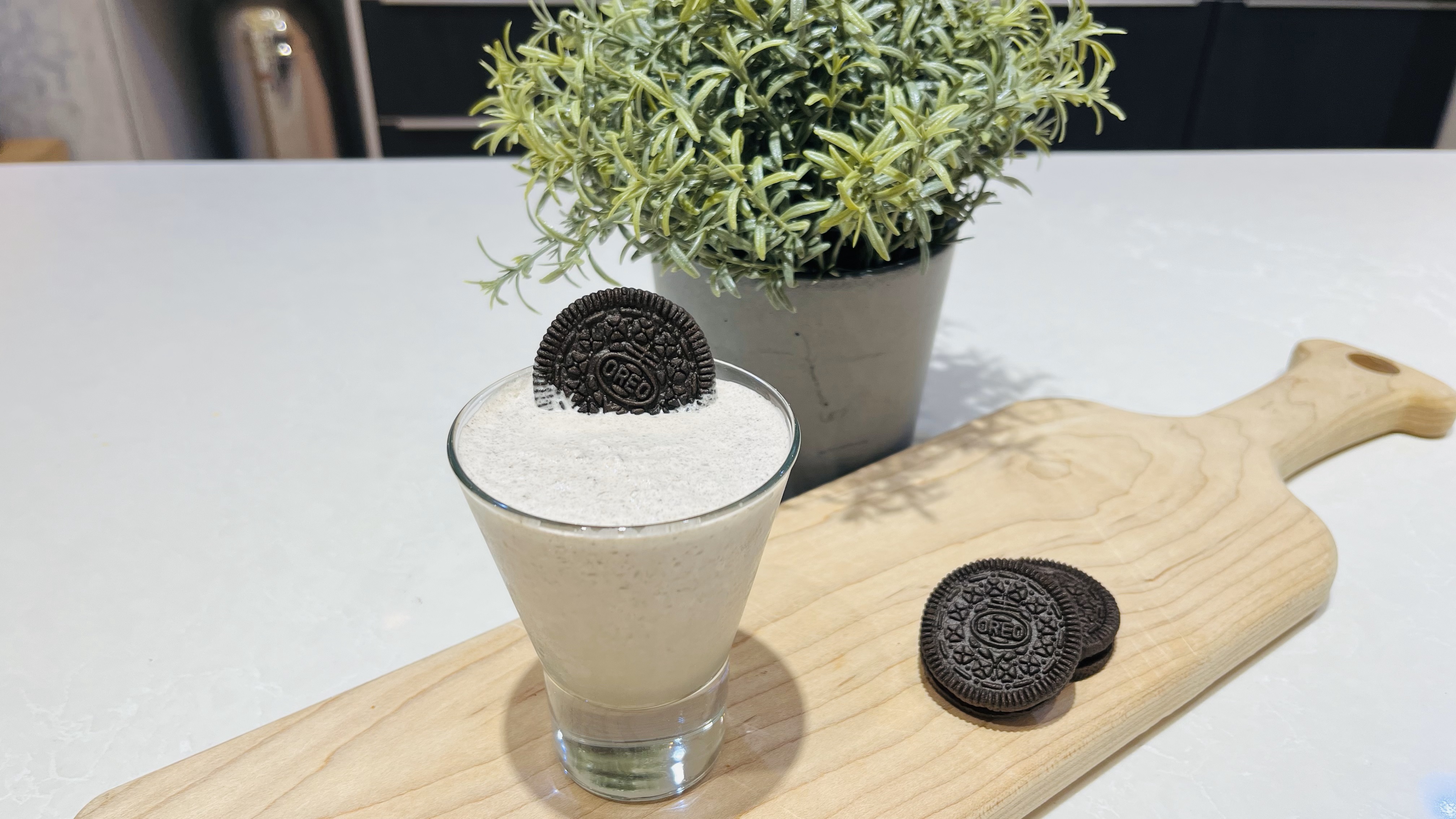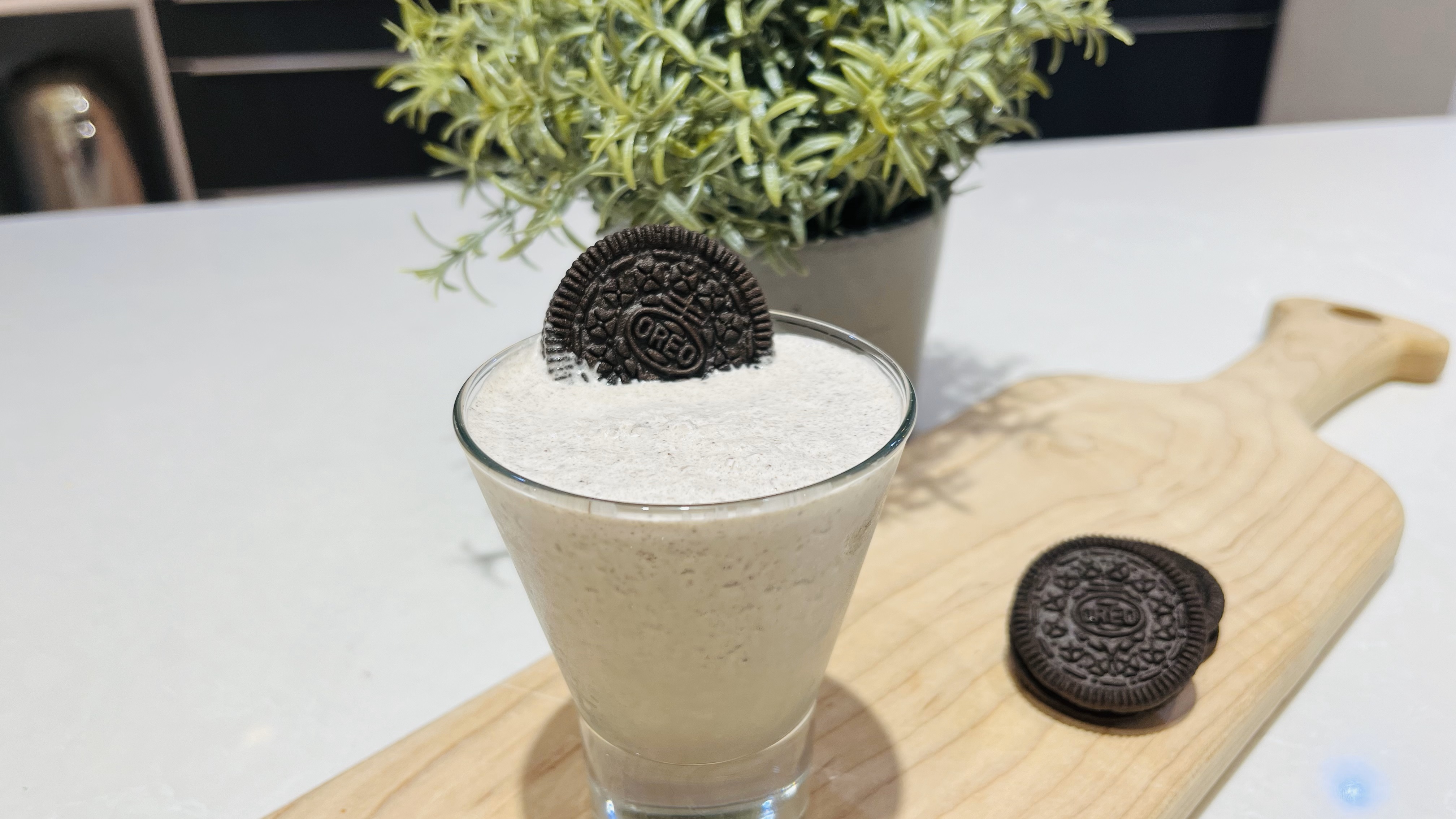 將完成的冰沙倒入容器中,並將預留的 2片 Oreo 餅乾放置於上方裝飾