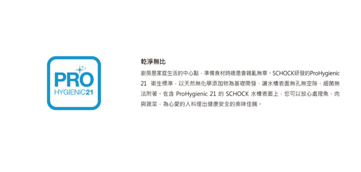 擁有頂尖的水槽表面抗菌處理科技,並研發制定 SCHOCK 高品質確認的內部衛生標準 ProHygienic 21,以天然無化學添加物為基礎開發,讓水槽表面無孔隙且無微生物附著;同時結合 SCHOCK 防污效果,能確保髒污與細菌被水沖走,防止細菌附著擴散,並保證不含銀離子且無使用期限。