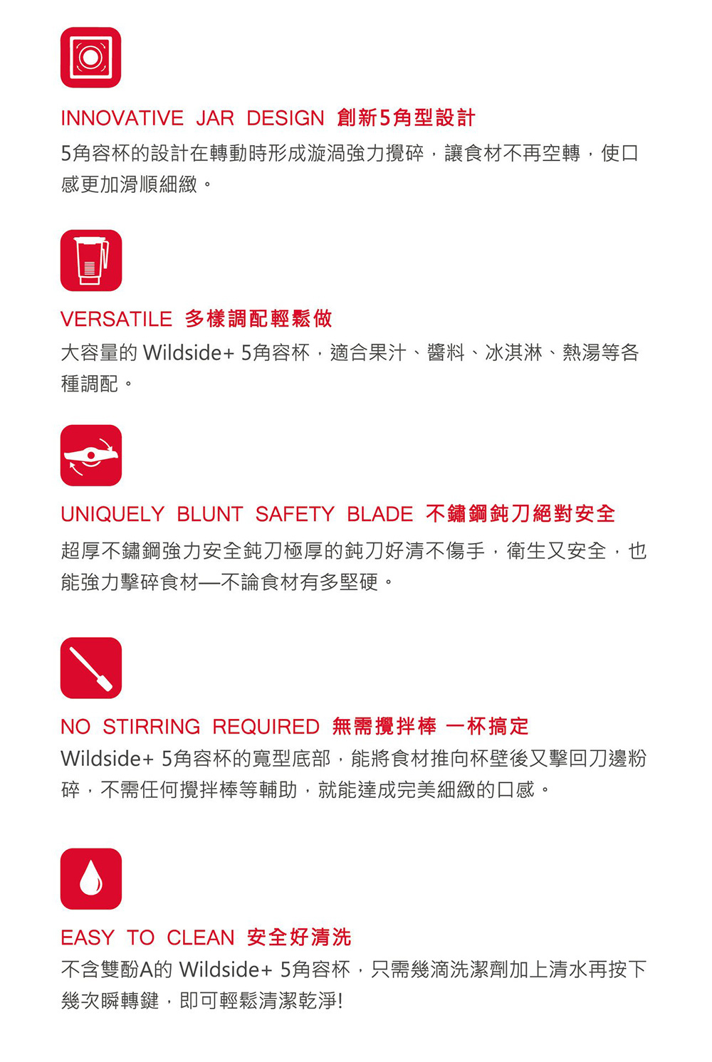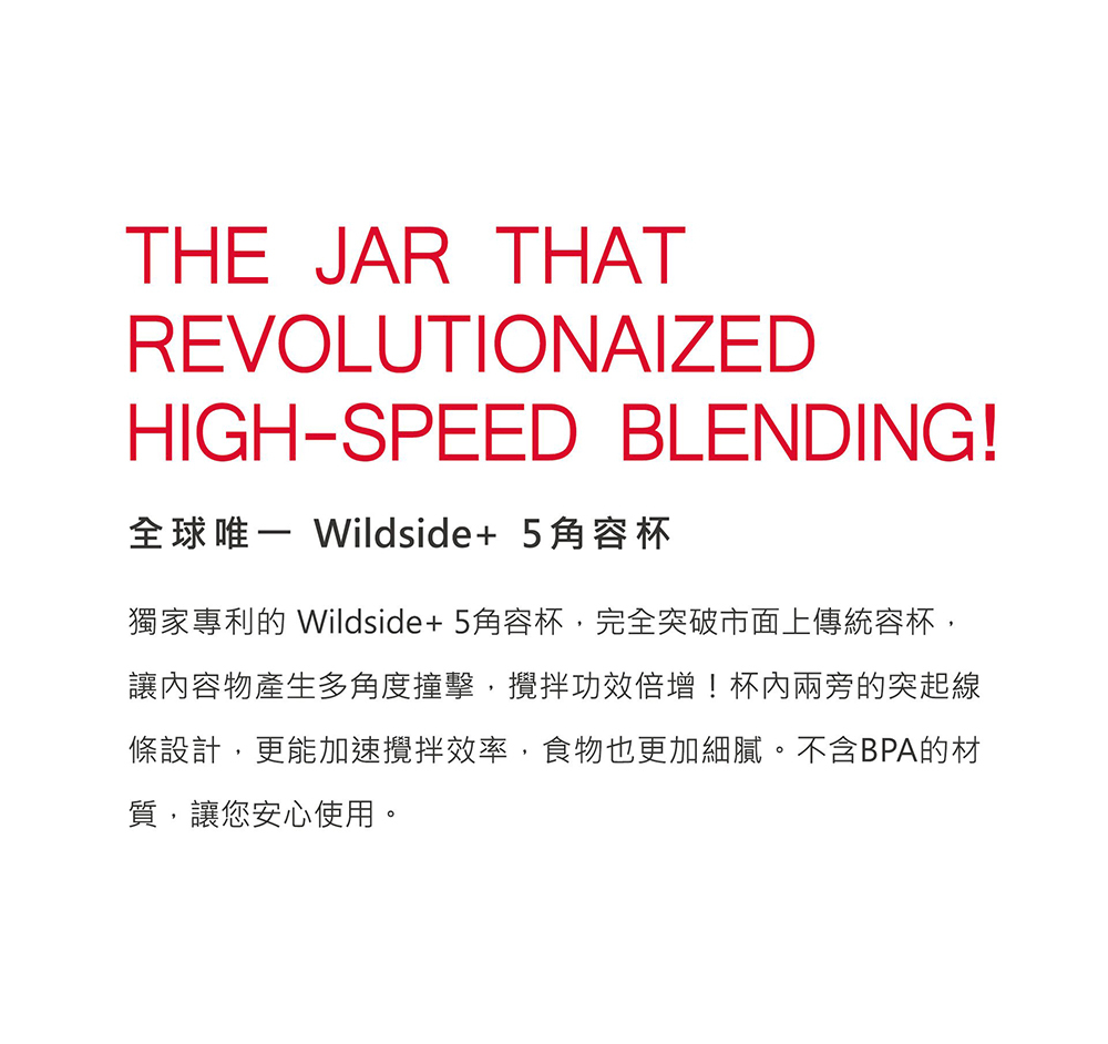 受專利保護的Wildside+ 5角容杯,比一般容杯多了1角,讓內容物產生漩渦,攪拌功能倍增 !